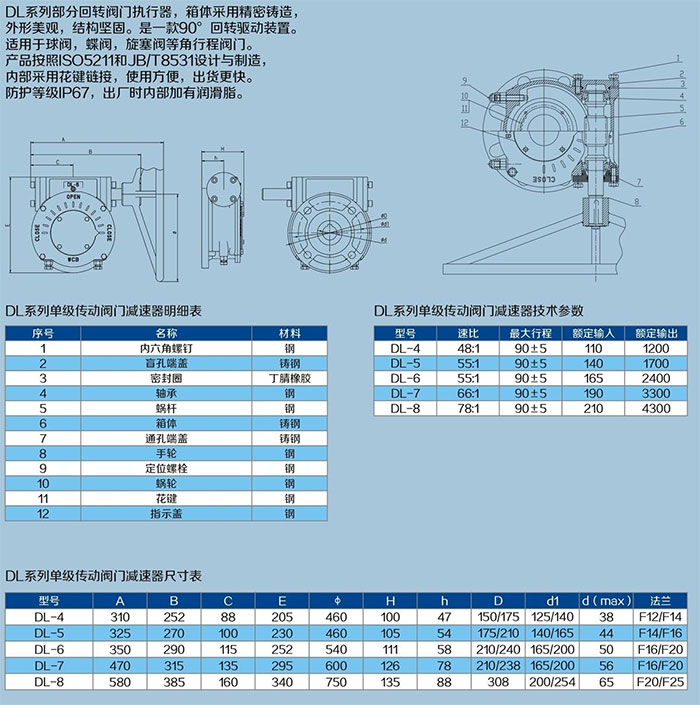 DL系列部分回轉(zhuǎn)閥門執(zhí)行器,殼體采用WCB鑄造,蝸輪采用QT500-7,蝸桿使用45鋼調(diào)質(zhì),蝸桿軸支撐使用圓錐滾子軸承更科學。適用于球閥、蝶閥、旋塞閥等角行程閥門。產(chǎn)品按照ISO5211和JB/T8531設(shè)計、制造與檢驗。蝸輪與軸套采用花鍵連接,使用方便,出貨更快。產(chǎn)品防護等級有IP65,具有90±5°調(diào)節(jié)功能。